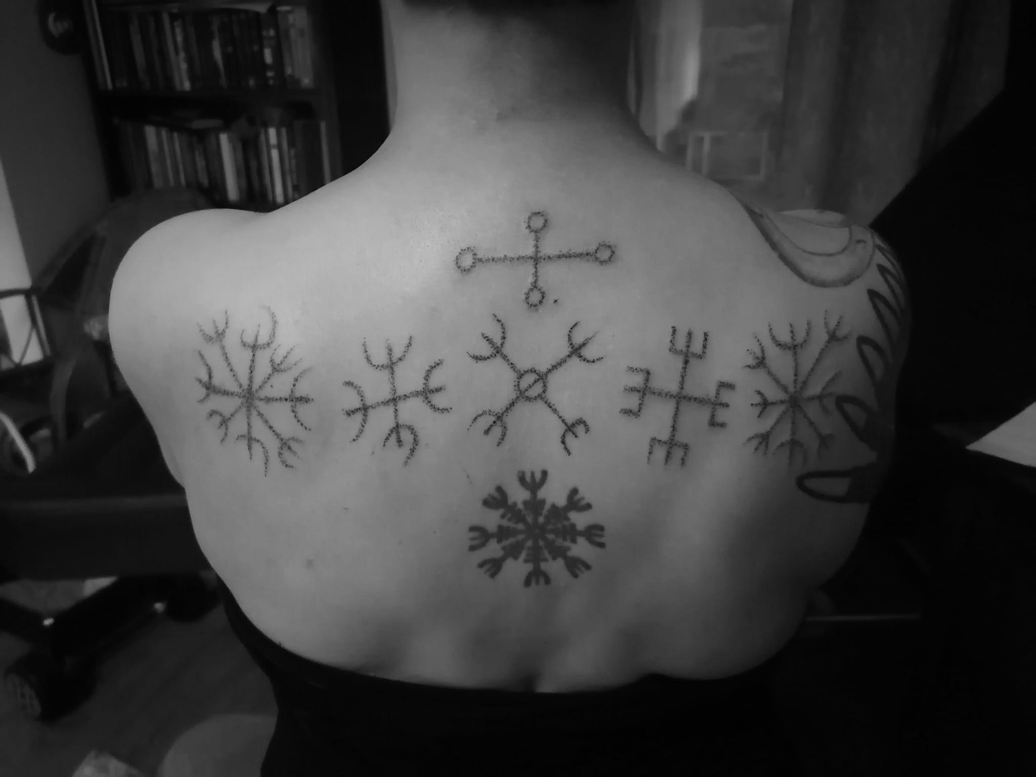 tehtiin iso selkätatuointi. Selkä oli syöpähoidoista